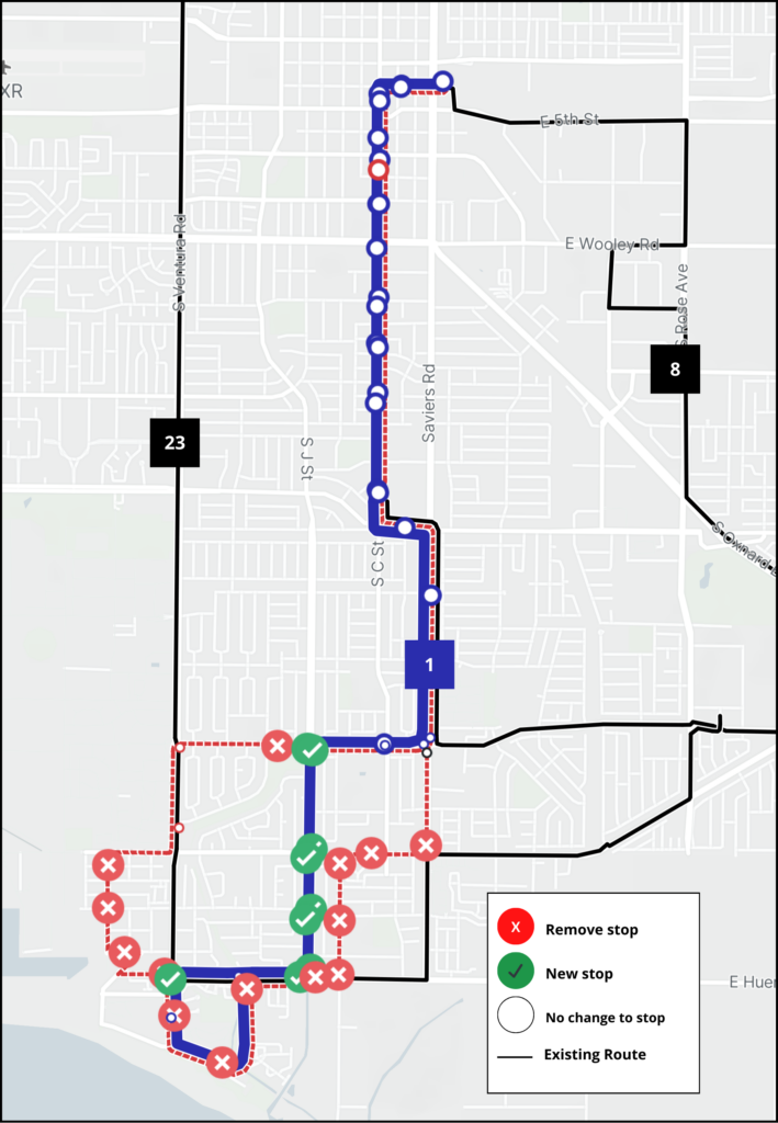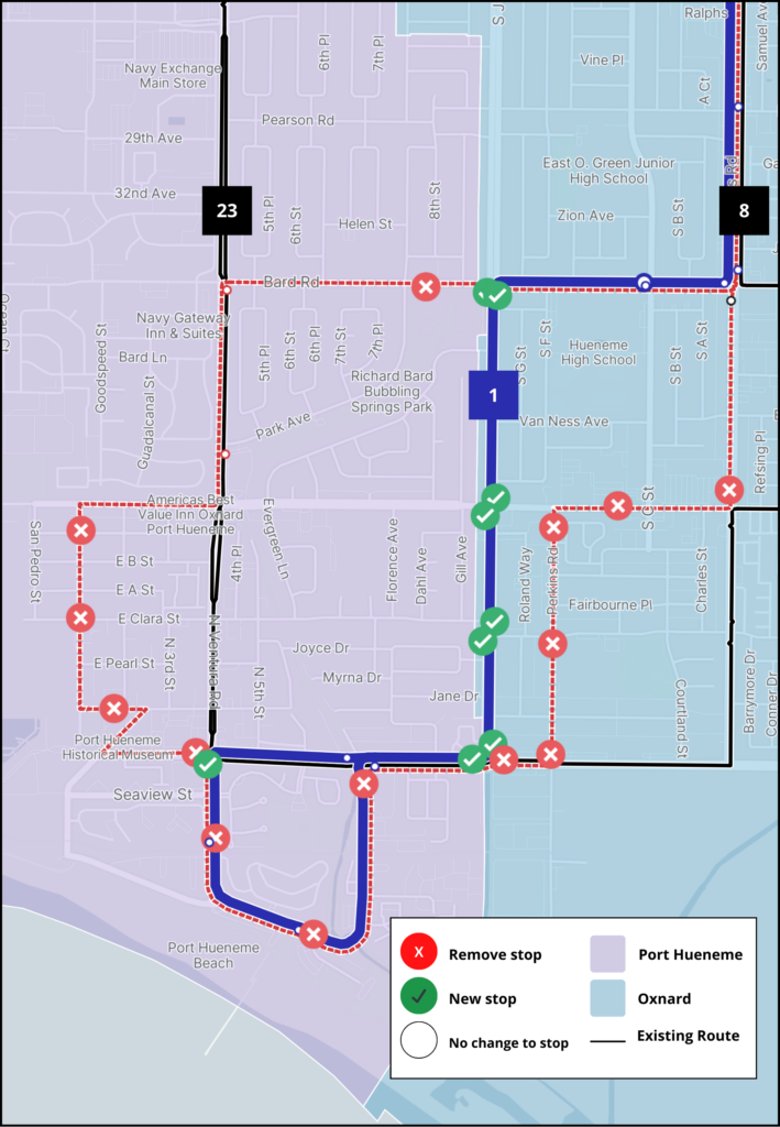 Changes to this route will include combining Routes 1A and 1B into a singular Route 1. Service on the 1B on Bard toward Ventura Road and service on the 1A on Pleasant Valley and Perkins will be discontinued. Service on the south end of the route will be re-aligned to provide service on J Street towards Hueneme Road. Service on Ponoma Street will also be discontinued.