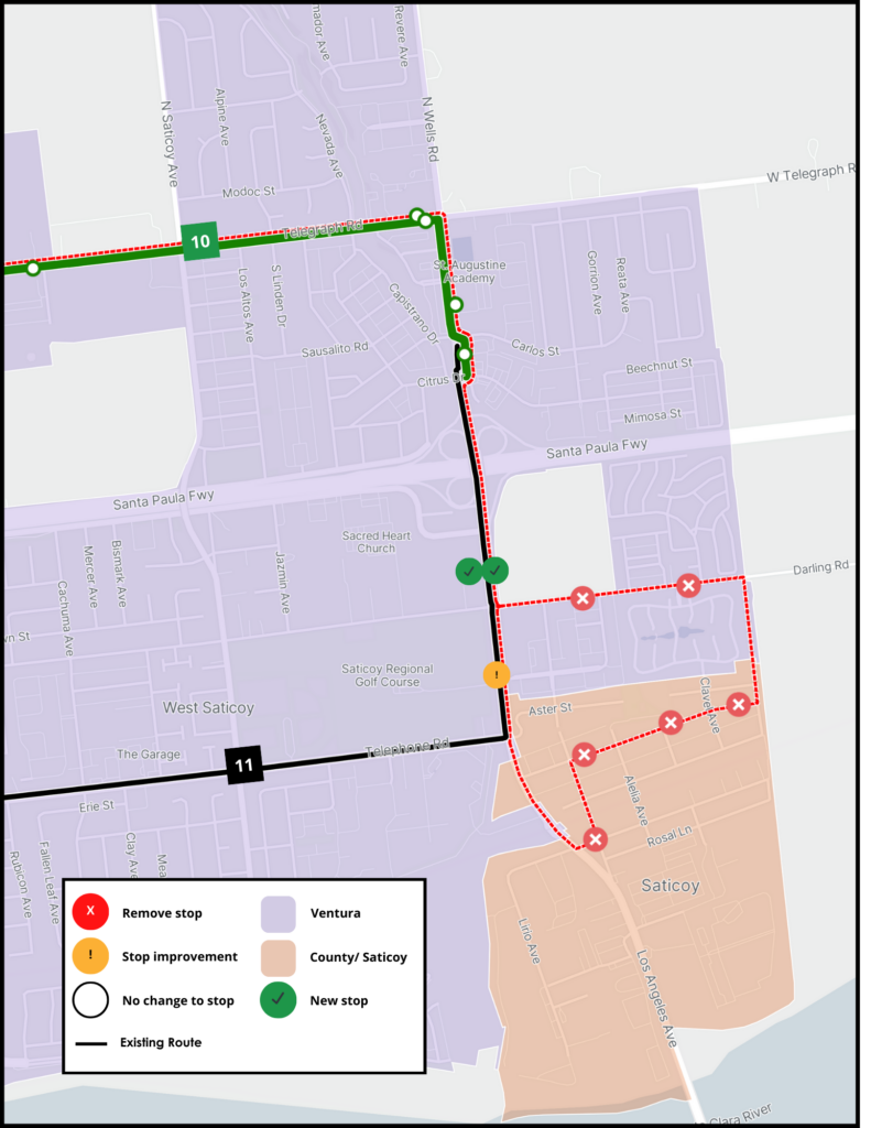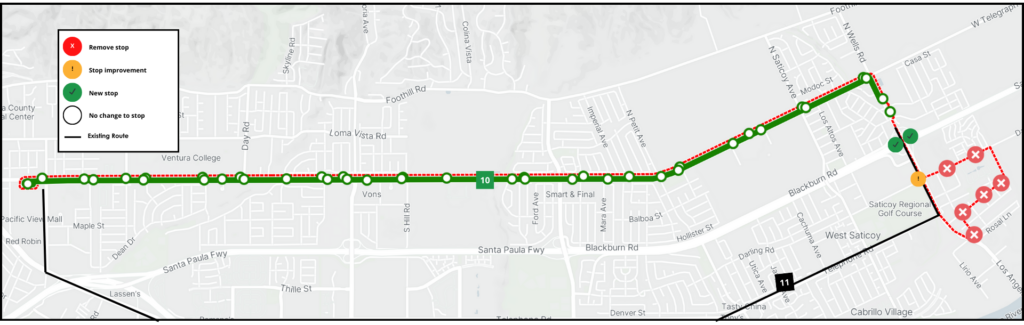 There will be no routing changes, but certain Route 11 trips will interline with Route 10 at the Wells Center. Service to the Saticoy neighborhood will be provided by Route 11 with new stops or stop improvements on Wells Road. Additionally, between 7:00am and 7:00pm, buses will run every 30 minutes.
